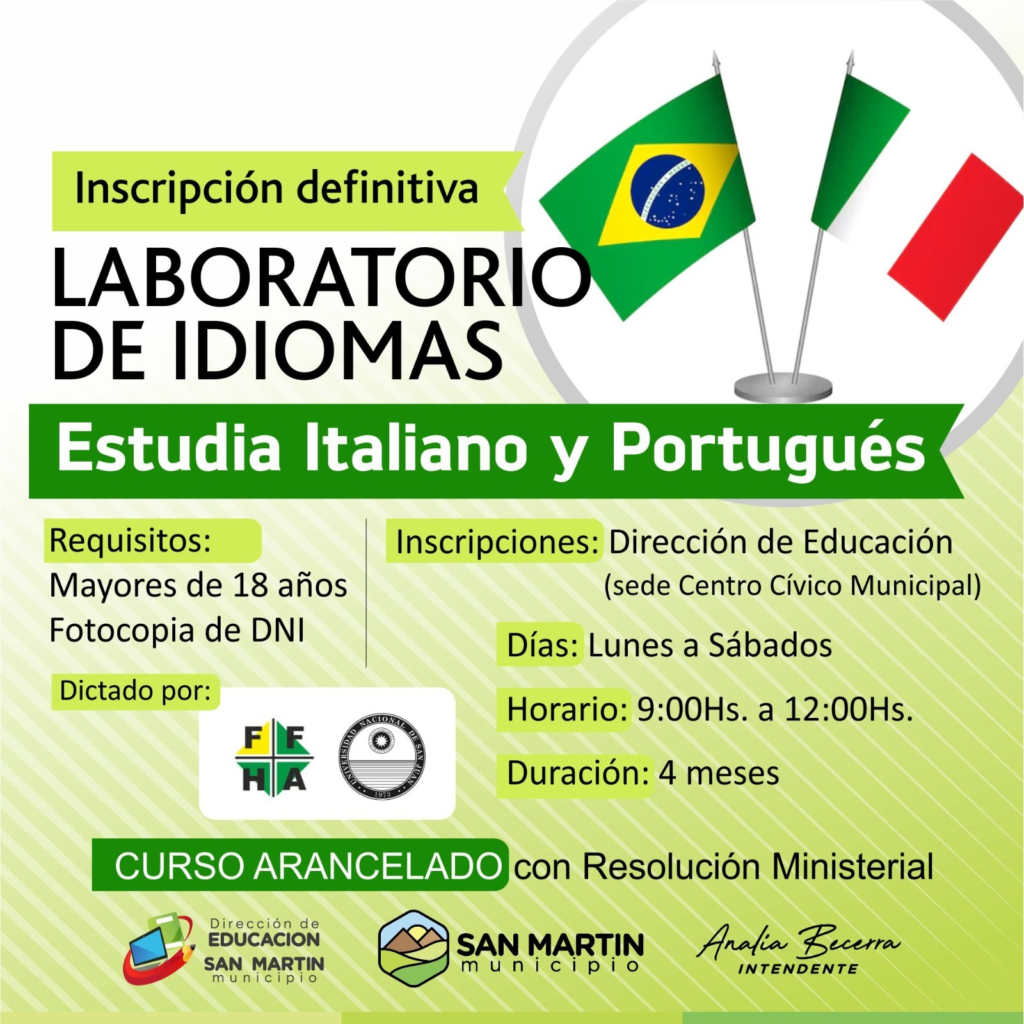 La Municipalidad de San Martín informa que ya se encuentran abiertas las inscripciones definitivas para cursar Italiano y Portugués.