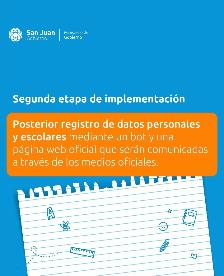 El Ministerio de Gobierno añadió que próximamente se lanzará la segunda etapa de implementación del Boleto Escolar y Docente Gratuito, que se llevará a cabo mediante el registro de datos personales y escolares a través de un bot y de una página web oficial. Este procedimiento permitirá que los estudiantes y docentes migren de forma progresiva al sistema SUBE, consolidando el nuevo esquema de control y acceso al beneficio. #InicioDelTransporteEscolarEnSanJuan