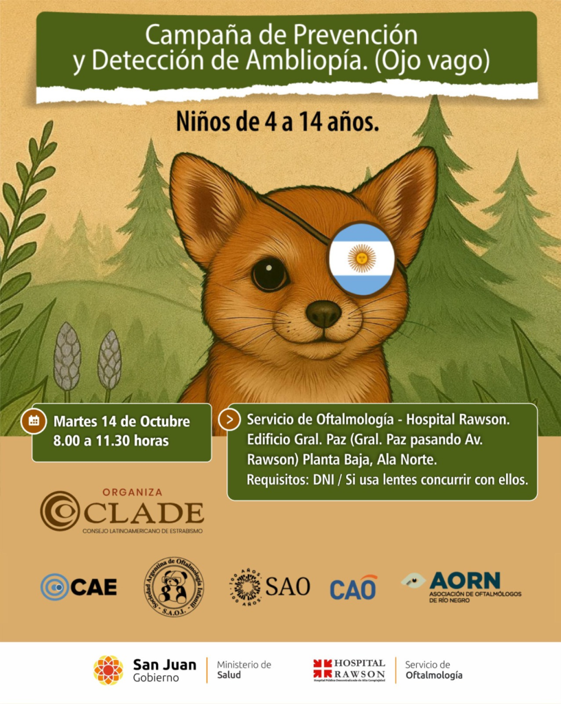 El Servicio de Oftalmología realizará una campaña de detección de ambliopía (u «ojo vago») para niños de 4 a 14 años. La campaña se llevará a cabo el martes 14 de octubre de 8:00 a 11:30 horas en el Edificio Gral. Paz (Gral. Paz pasando Av. Rawson), Planta Baja, ala norte.