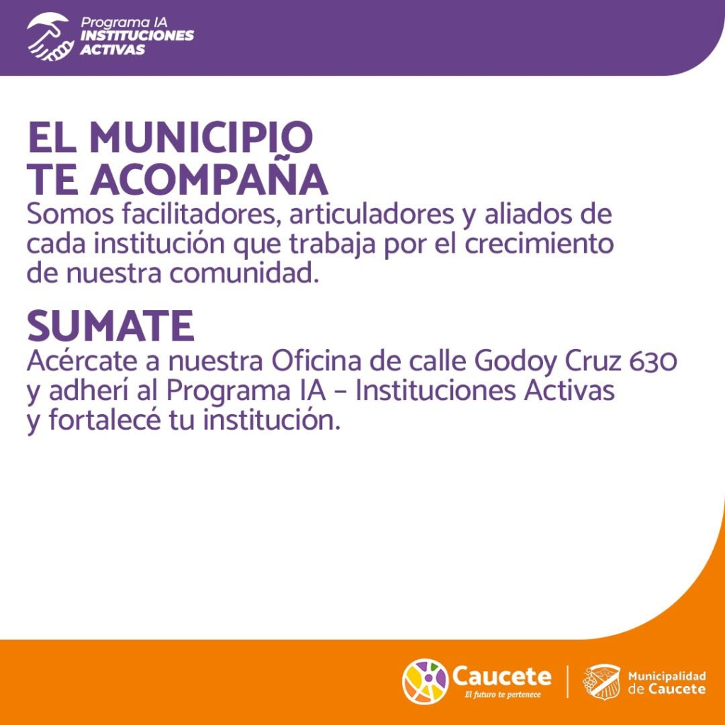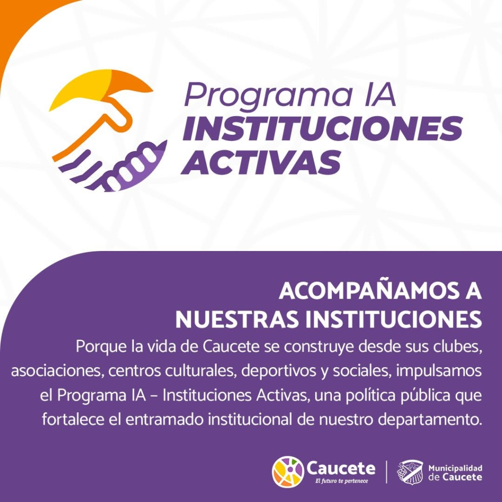 Se está implementando el Programa IA – Instituciones Activas con el objetivo de acompañar y fortalecer a todos los clubes, asociaciones, centros culturales, deportivos y sociales que son pilares de la vida comunitaria. A través de este programa, la comuna brinda asesoramiento, capacitación y acompañamiento específico para ayudar a cada institución a regularizar su situación, formalizar sus estructuras y potenciar sus actividades, promoviendo activamente la participación ciudadana, la transparencia y el desarrollo local. Las instituciones interesadas pueden sumarse acercándose a la Oficina ubicada en calle Godoy Cruz 630. #ProgramaIAEnCaucete