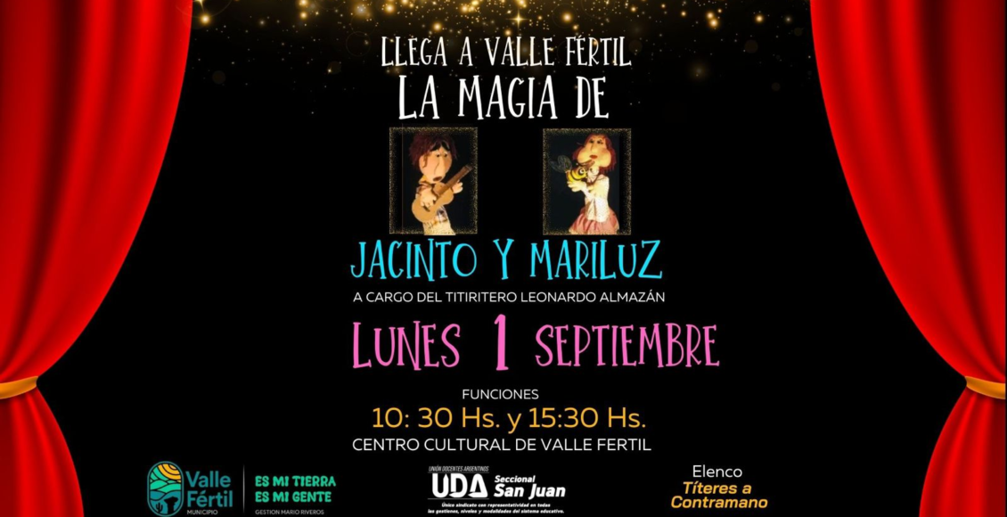 Llega a Valle Fértil la magia de Jacinto y Mariluz, a cargo del titiritero Leonardo Almazán. El lunes 1 de septiembre habrá funciones a las 10:30 y 15:30 hs en el Centro Cultural de Valle Fértil. El martes 2 de septiembre habrá una función a las 9:00 hs en el Salón de Usos Múltiples en Astica. Invitan y organizan UDA Seccional San Juan, Municipalidad de Valle Fértil y Elenco Títeres a Contramano. ¡Los esperamos a todos! #FestejoDelDíaDelNiñoEnAstica