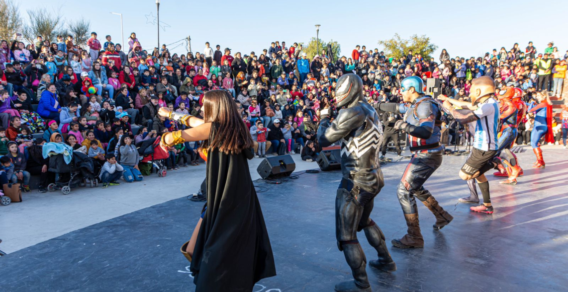 La Compañía Marvel, con Spiderman, Capitán América, Ironman, Wonder Woman y Venom, hizo delirar a grandes y chicos con sus aventuras en vivo. Además de ellos, estuvo presente una figura animada de Lionel Messi, para el disfrute de los más pequeños que lo ovacionaron hasta el final.
