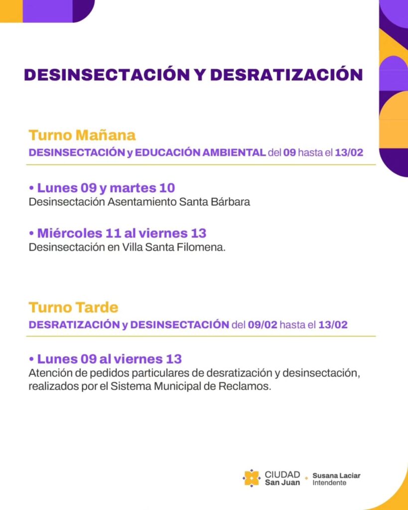 La Municipalidad informó que del 9 al 13 de febrero se llevará a cabo una nueva etapa de desinsectación y desratización en diversos barrios de la ciudad. Los operativos se realizarán en turnos de mañana y tarde con el objetivo de reducir la incidencia de plagas y prevenir brotes de enfermedades transmitidas por estos vectores.