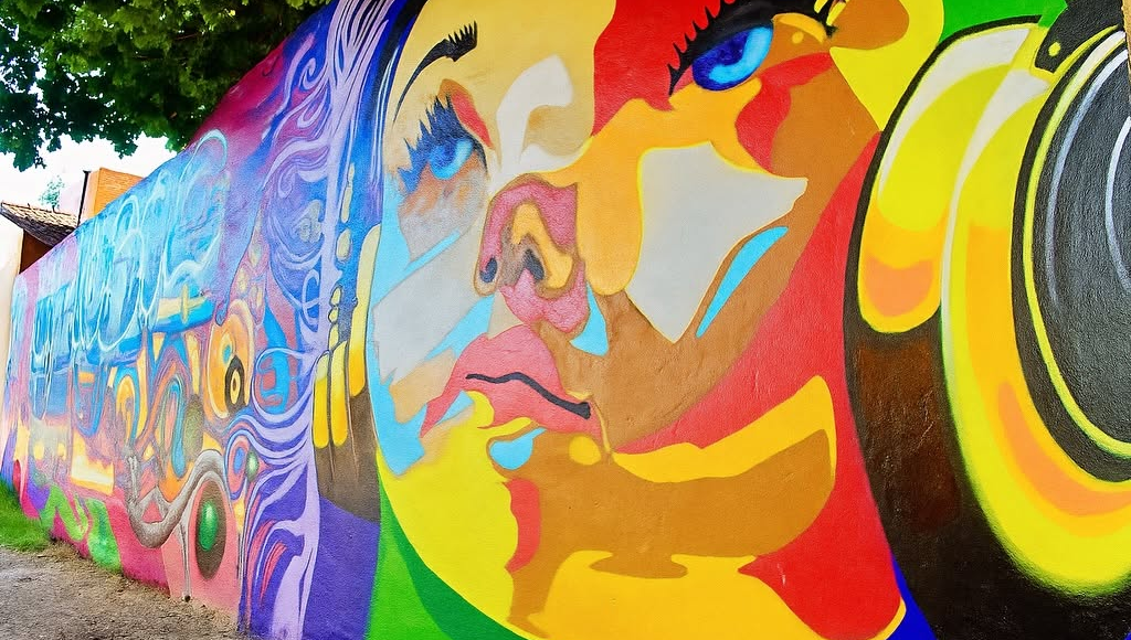 Este mural, caracterizado por una mujer con auriculares en un estilo que mezcla retrato y abstracción geométrica, se ha convertido en un punto focal de atención. La combinación de colores vivos y las formas en espiral sugieren una inmersión total en la cultura o la música, sirviendo como un poderoso elemento de cohesión y orgullo para los vecinos.