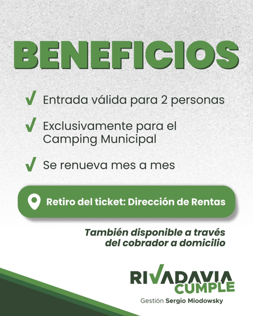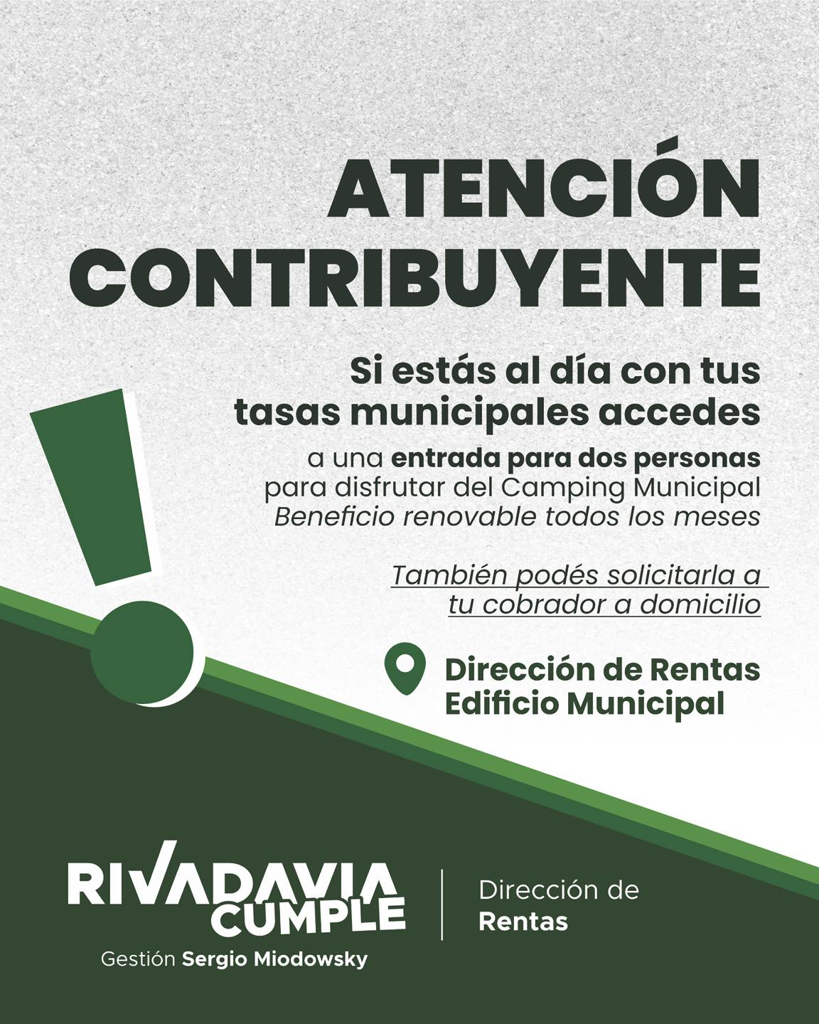 El municipio de Rivadavia ratificó una iniciativa destinada a reconocer el compromiso de los contribuyentes: quienes mantengan al día sus tasas municipales acceden a una entrada para dos personas para disfrutar del Camping Municipal. El beneficio se renueva cada mes y busca incentivar la regularidad en el cumplimiento de las obligaciones fiscales.