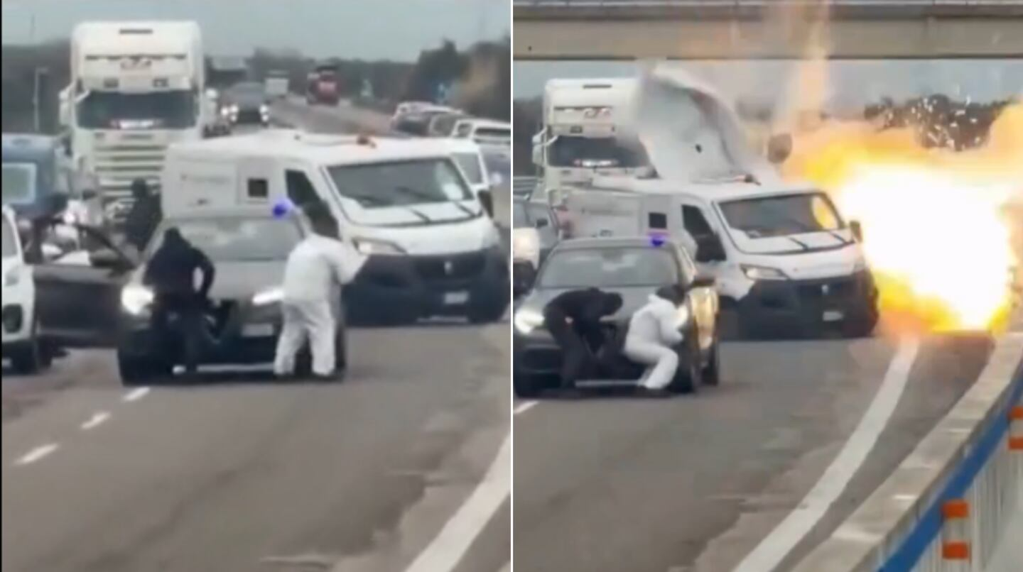Luego, varios miembros del comando bajaron armados con metralletas, atacaron a balazos uno de los vehículos y volaron las puertas con explosivos. El hecho dejó atrapados a decenas de automovilistas, que quedaron en medio del fuego cruzado y el caos total. #GolpeComandoEnItalia