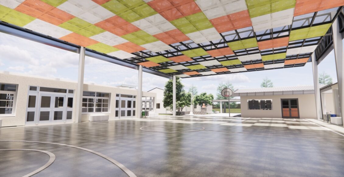 • Techado del patio cívico: se construirá una cubierta con chapas perforadas de colores, sostenida por una estructura mixta de hormigón armado y metálica, lo que permitirá utilizar el espacio como área de actividades físicas y recreativas.