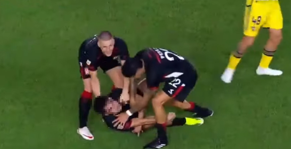 La caída pasó a mayores cuando el futbolista no reaccionaba y tuvo algunos síntomas de convulsión en el césped, por lo que los médicos y la ambulancia tuvieron que ingresar a la cancha para asistir al futbolista, que estaba lejos de seguir el partido.