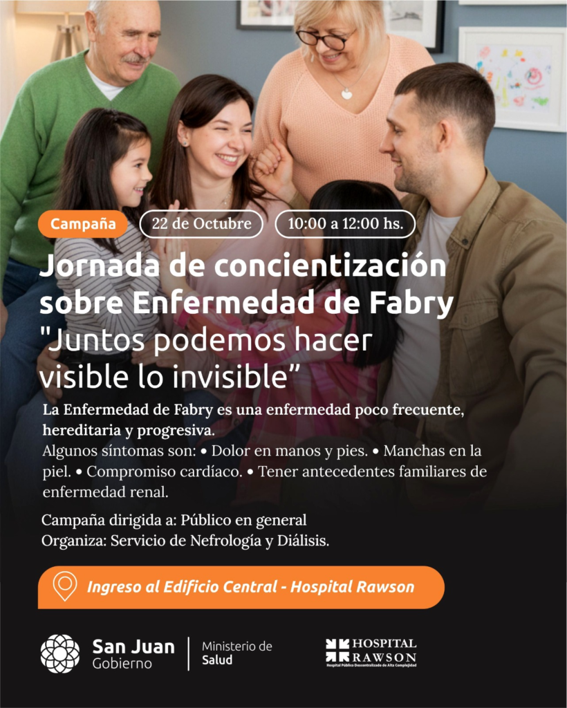 El Hospital Rawson invita a la comunidad a participar de la jornada de concientización sobre la Enfermedad de Fabry, una enfermedad poco frecuente, hereditaria y progresiva.