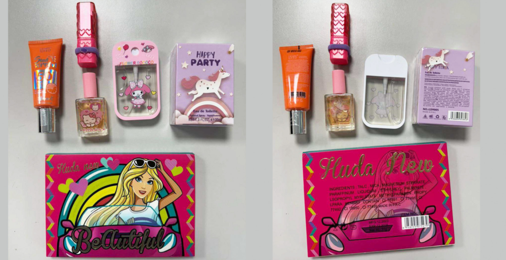Entre los artículos prohibidos se encuentran distintos labiales, brillos labiales y una paleta de sombras dirigidos al público infantil, comercializados bajo marcas como “POLA AYIR”, “MAGIC YOUR LIFE”, “RPK” y “FAVOR BEAUTY”, todos ellos de origen importado.