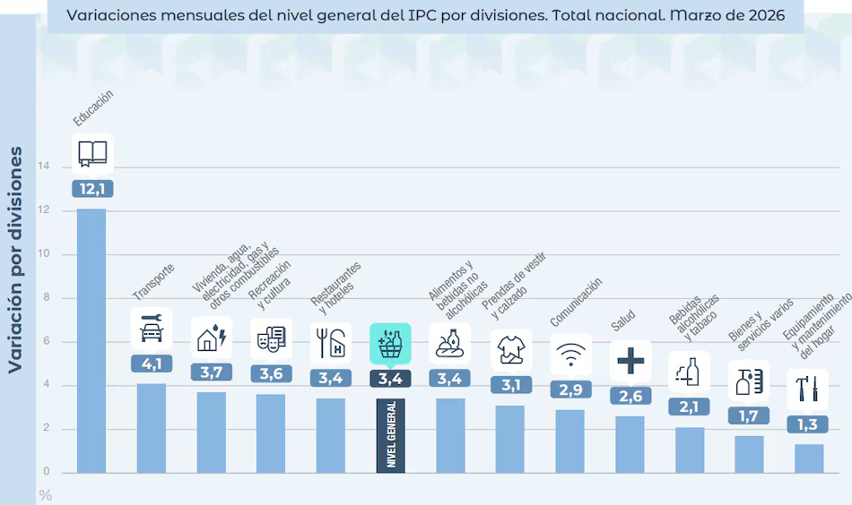 El Instituto Nacional de Estadística y Censos (INDEC) informó que la inflación de marzo de 2026 fue del 3,4%, el registro mensual más alto en lo que va del año. Con este dato, el Índice de Precios al Consumidor (IPC) acumula un incremento del 9,2% en el primer trimestre y un 32,6% en los últimos 12 meses.