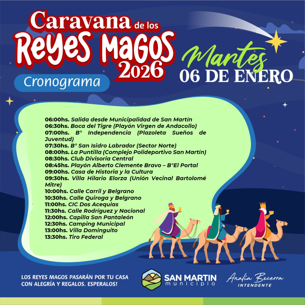 La Municipalidad de San Martín invita a la comunidad a vivir la tradicional visita de Melchor, Gaspar y Baltasar, que recorrerán barrios, clubes e instituciones para compartir alegría y regalar sonrisas.