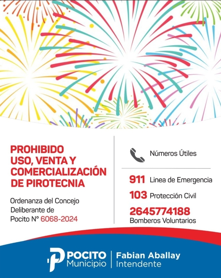 La Municipalidad de Pocito recordó a los vecinos que, en virtud de las próximas fiestas, rige la prohibición total en el departamento sobre el uso, venta o comercialización de cualquier tipo de pirotecnia.