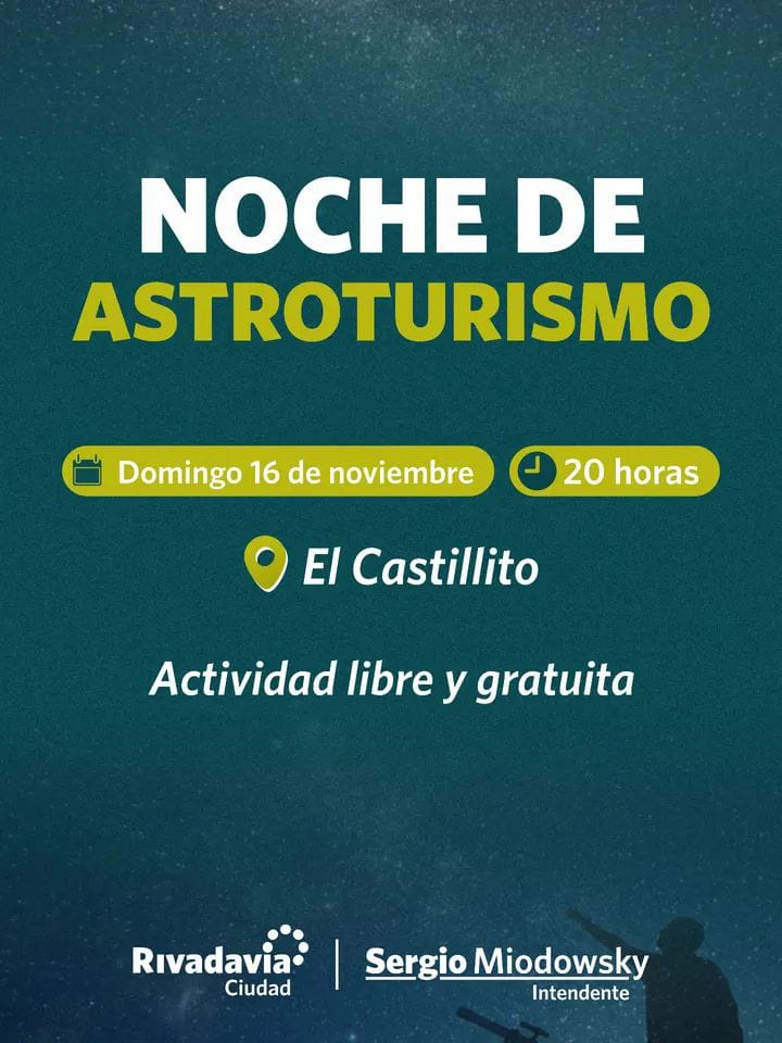 La intendencia de Rivadavia, a través de la gestión de Sergio Miodowsky, ha organizado una actividad especial de astroturismo para este fin de semana. El evento está programado para el domingo 16 de noviembre a las 20:00 horas en el punto conocido como El Castillito.
