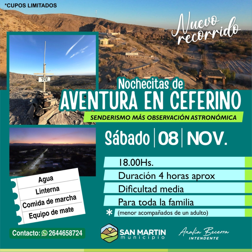 San Martín invita a vivir una nueva edición de “Nochecitas de Aventura en Ceferino”, una propuesta pensada para disfrutar en familia bajo el cielo sanjuanino. La jornada, de dificultad media y una duración estimada de cuatro horas, propone recorrer los paisajes del cerro Pie de Palo en un entorno que fusiona espiritualidad, aventura y contacto con la naturaleza.