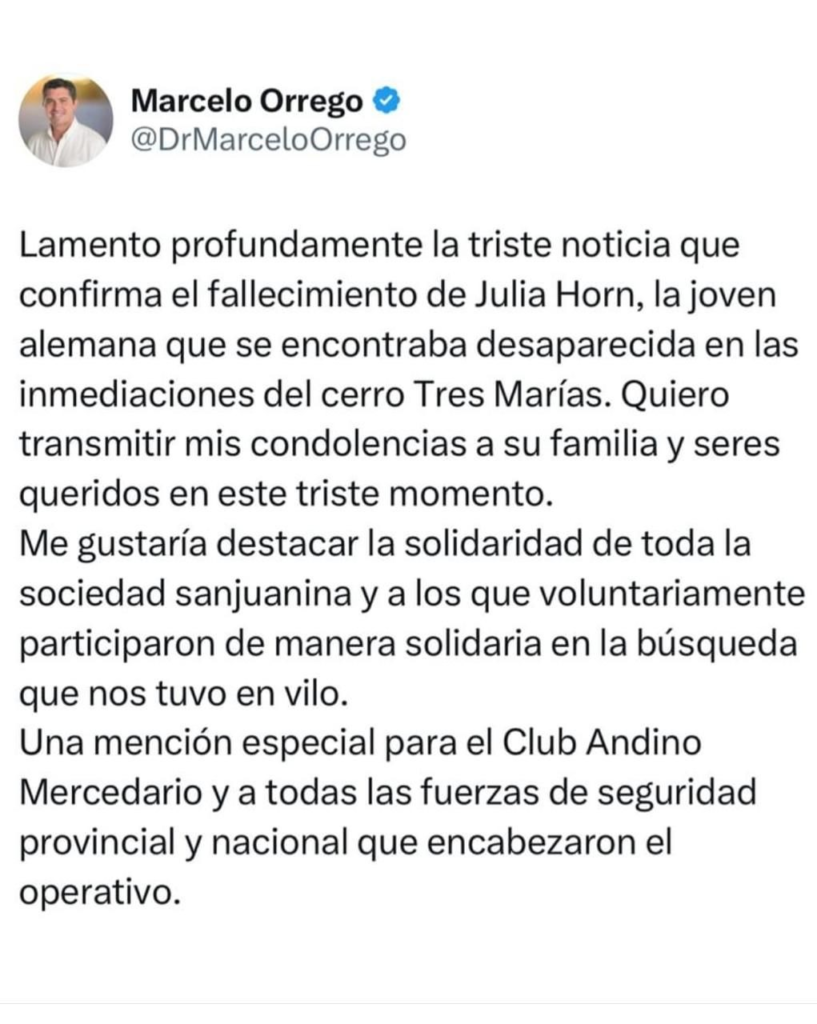 En su mensaje, Orrego expresó su profundo pesar por la pérdida de Julia y destacó la solidaridad y el apoyo que la comunidad sanjuanina ha mostrado durante estos difíciles días de búsqueda. «En nombre de todos los sanjuaninos, quiero expresar nuestras más sinceras condolencias a la familia de Julia Horn. Este trágico desenlace nos llena de tristeza y dolor. Agradezco a todos los que han colaborado en la búsqueda y han mostrado su apoyo en estos momentos tan duros», escribió el gobernador.