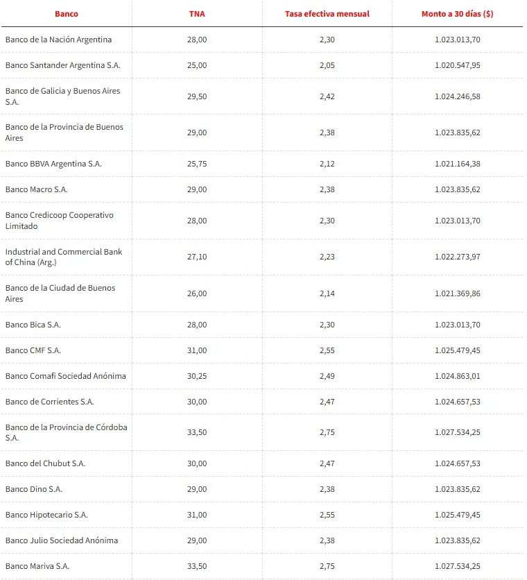 En el universo de bancos que permiten constituir plazos fijos online a no clientes, la competencia es más intensa. El Banco Bica S.A. lidera con una tasa del 33%, que lleva el capital más intereses a $1.027.055 en 30 días. El Banco CMF S.A. y el Banco de Comercio S.A. informan una tasa de 33,5%, lo que eleva el rendimiento a $1.027.427. El Banco Meridian S.A. y el Banco VOII S.A. alcanzan el 33,25%, con $1.027.241. El Banco Mariva S.A. ofrece 32,5%, que significa $1.026.674. El Banco del Sol S.A., en su mejor alternativa, paga 32% y permite llegar a $1.026.301. #PagosPorInteresesPlazoFijo
