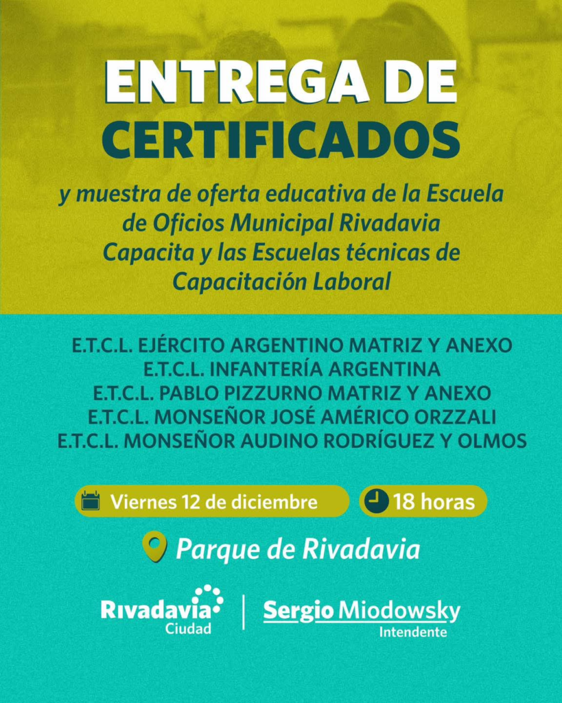 La Municipalidad de Rivadavia organizará un acto central para celebrar la formación de sus vecinos y promover la inserción laboral a través de sus programas educativos. Este viernes 12 de diciembre, a las 18:00 horas, en el Parque de Rivadavia, se llevará a cabo la entrega de certificados a los egresados de las escuelas de oficios municipales «Rivadavia Capacita» y las Escuelas Técnicas de Capacitación Laboral (E.T.C.L.).