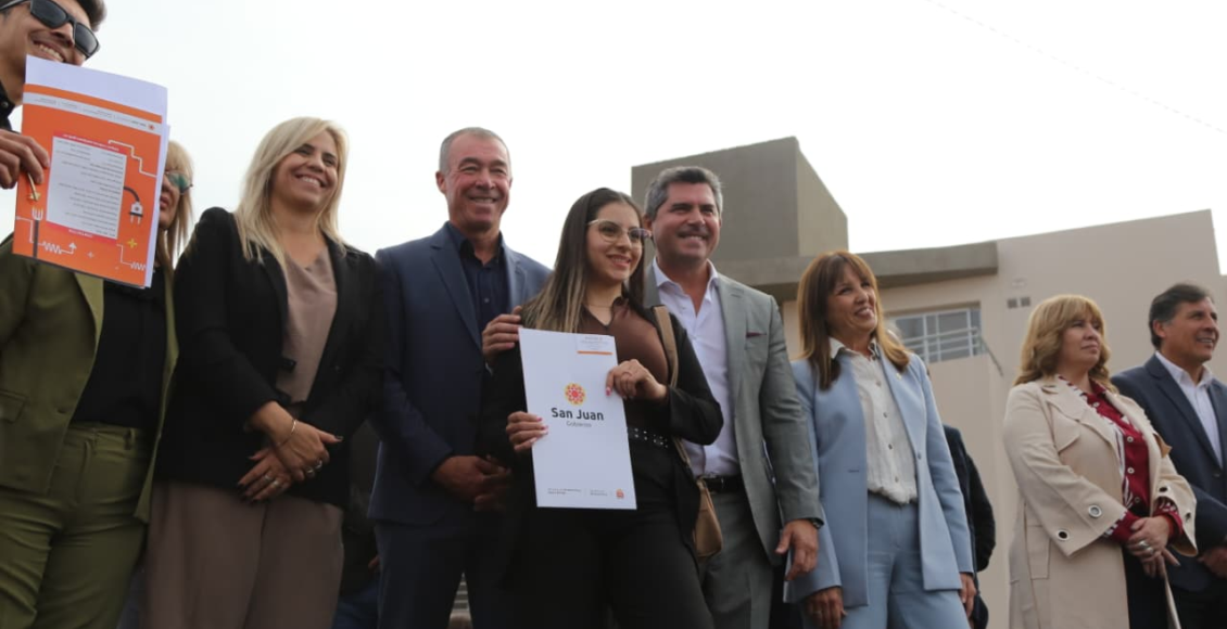 El gobernador Marcelo Orrego encabezó la entrega de 260 viviendas del barrio Los Molinos, ubicado en la calle Octavio Gil, al Norte de Sargento Cabral, en Capital. El acto contó con la presencia del vicegobernador Fabián Martín, la intendenta de Capital Susana Laciar y el ministro de Infraestructura, Fernando Perea, entre otros.