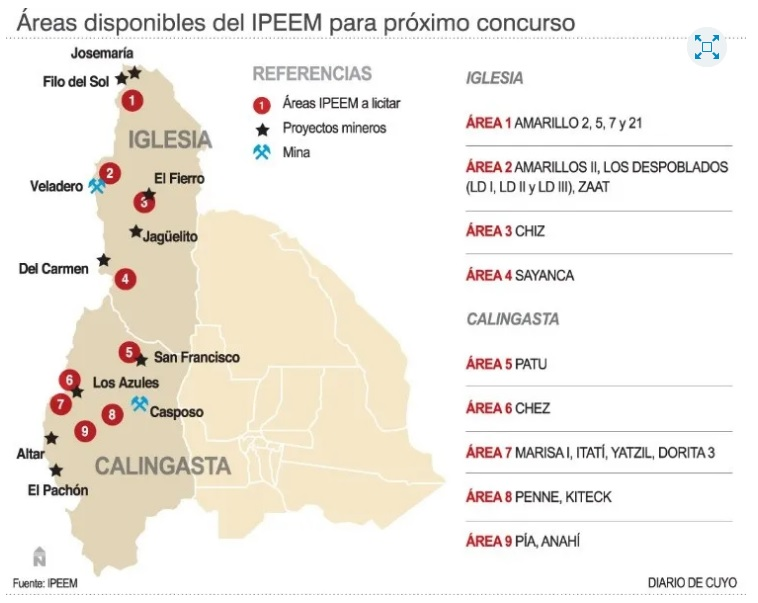 El IPEEM prepara un nuevo llamado a licitación pública para concesionar nueve áreas mineras, repartidas entre Iglesia (5) y Calingasta (4), con un total de 23 derechos mineros.