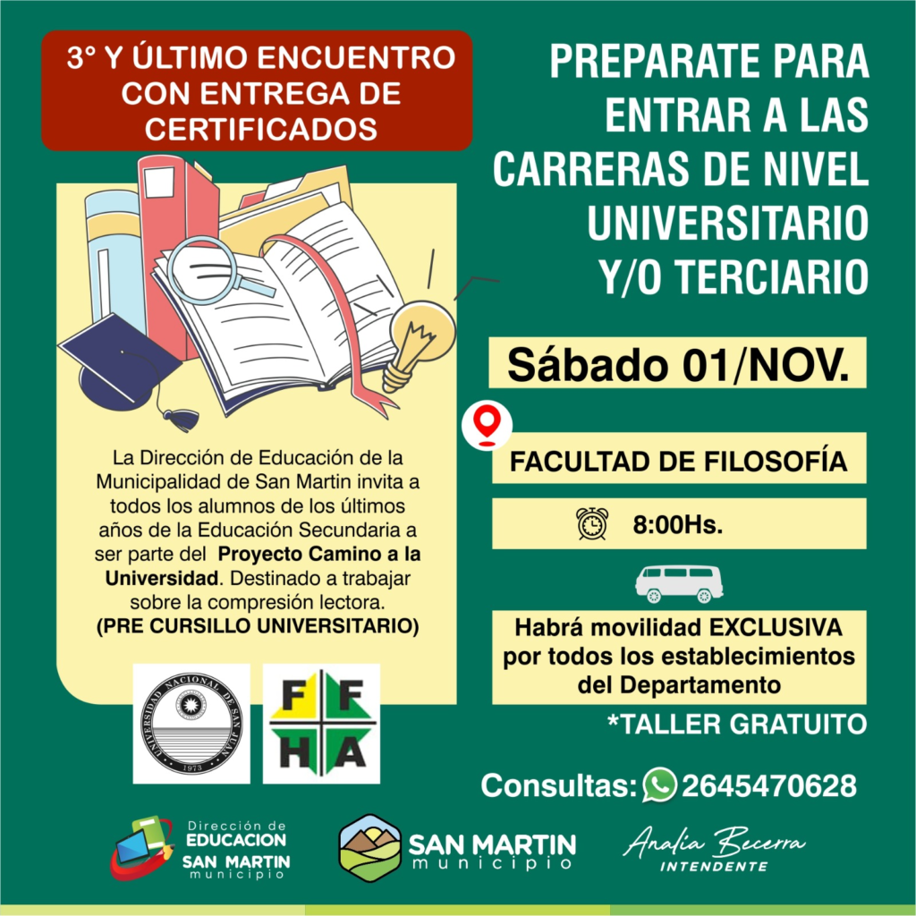 El Proyecto Camino a la Universidad, impulsado por la Dirección de Educación de la Municipalidad de San Martín, celebra su cierre este sábado con el último encuentro dirigido a acompañar a los jóvenes en su transición hacia los estudios superiores. La jornada se desarrollará en la Facultad de Filosofía, Humanidades y Artes a partir de las 8 hs e incluirá la entrega de certificados a los estudiantes que participaron de los distintos talleres.