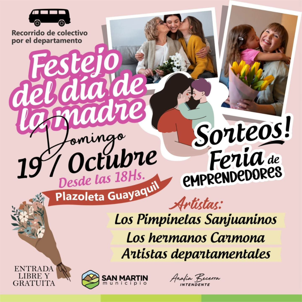 Se invita a toda la comunidad a celebrar el Día de la Madre con una gran jornada de festejos que se realizará este domingo 19 de octubre, desde las 18 horas, en la Plazoleta Guayaquil. El encuentro contará con espectáculos musicales, sorteos, feria de emprendedores y una tarde colmada de alegría y emoción para homenajear a las madres del departamento. En el escenario se presentarán Los Pimpinelas Sanjuaninos, Los Hermanos Carmona y artistas locales, quienes ofrecerán un repertorio variado para disfrutar en familia.