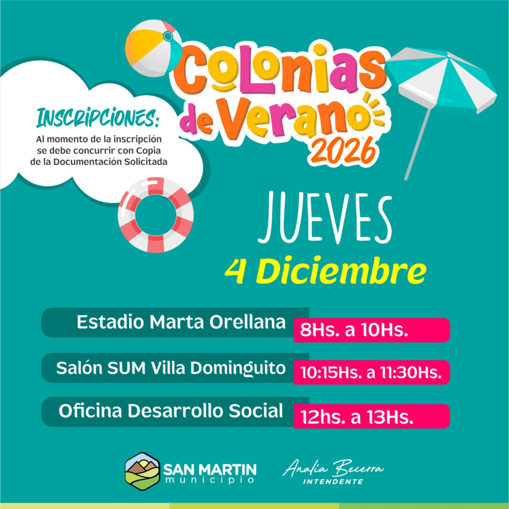 La Municipalidad de San Martín informó que este jueves 4 de diciembre se realizará una nueva jornada de inscripciones para las Colonias de Verano 2026.