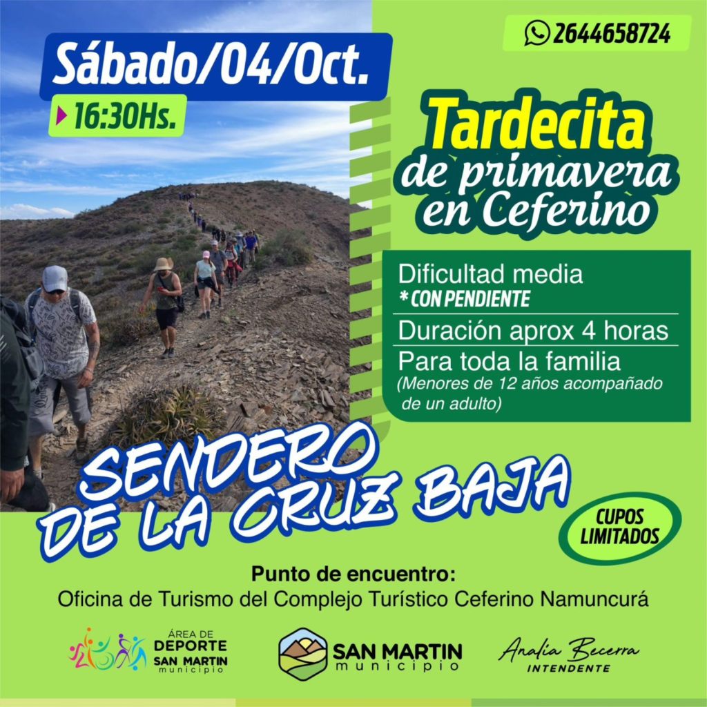 El punto de encuentro será la Oficina de Turismo del Complejo Turístico Ceferino Namuncurá. Los cupos son limitados, por lo que se recomienda asegurar el lugar comunicándose al 2644658724.