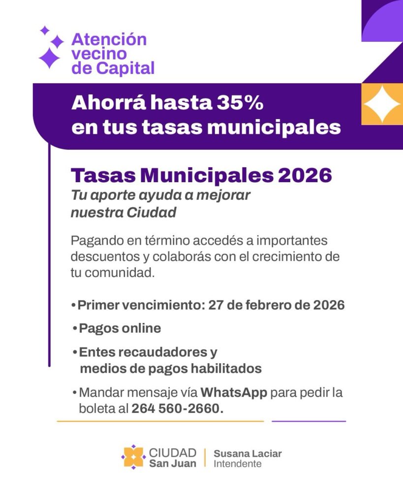 Además, se facilita la gestión digital a través de la web municipal y la solicitud de boleta vía WhatsApp al 264 560-2660.