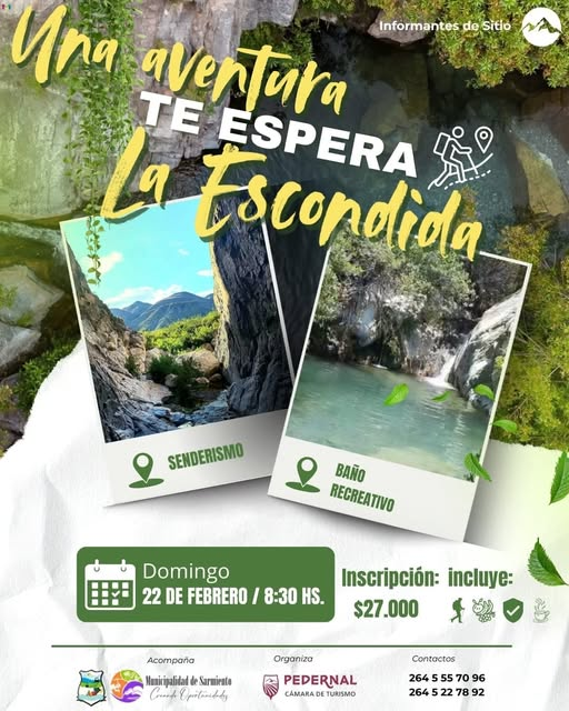 Este domingo 22 de febrero se realizará una jornada de senderismo guiado en La Escondida, con salida desde Cienaguita–Sarmiento. La actividad propone una experiencia de contacto con la naturaleza, recorriendo senderos serranos y visitando vertientes de agua, con caminata acompañada por Informantes de Sitio del departamento.