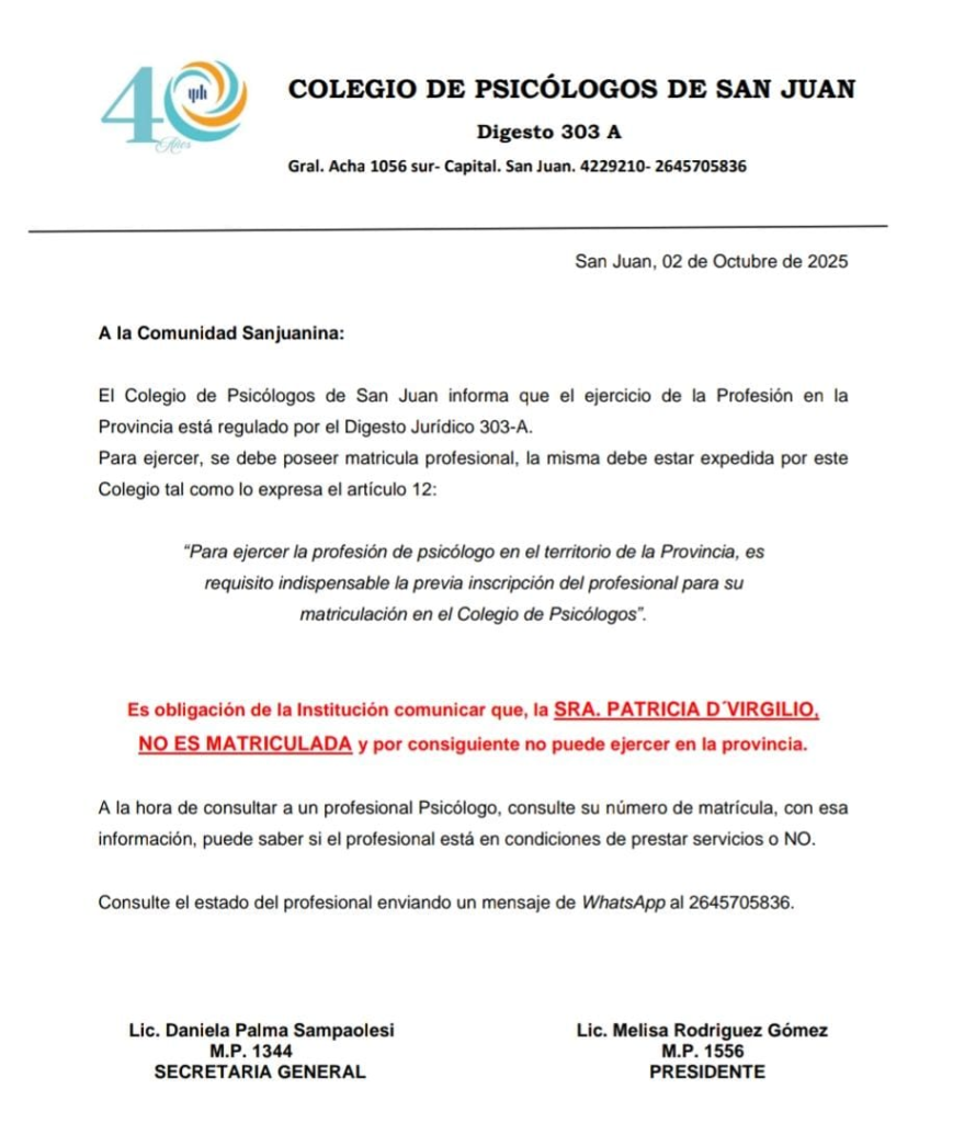 El Colegio de Psicólogos de San Juan ha emitido un comunicado denunciando a Patricia D´ Virgilio por ejercer ilegalmente la profesión en el municipio de 9 de Julio. Según el comunicado, De Virgilio no posee la matrícula profesional requerida para ejercer la psicología en la provincia.