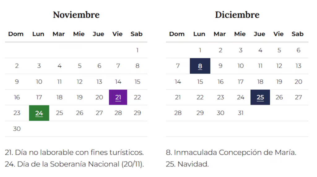- Lunes 8 de diciembre: Día de la Inmaculada Concepción de María (feriado inamovible).