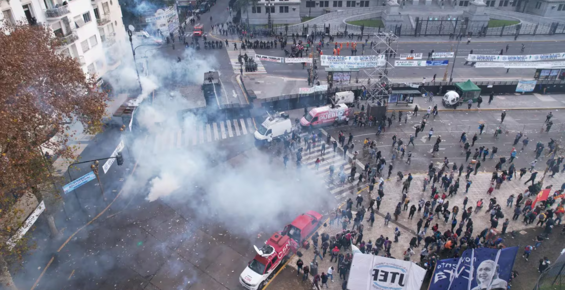 «La Policía intenta desalojar a los manifestantes que protestan contra la Ley Bases, desatando enfrentamientos y actos vandálicos. Los disturbios coinciden con la sesión en el Senado para discutir la controvertida legislación.»