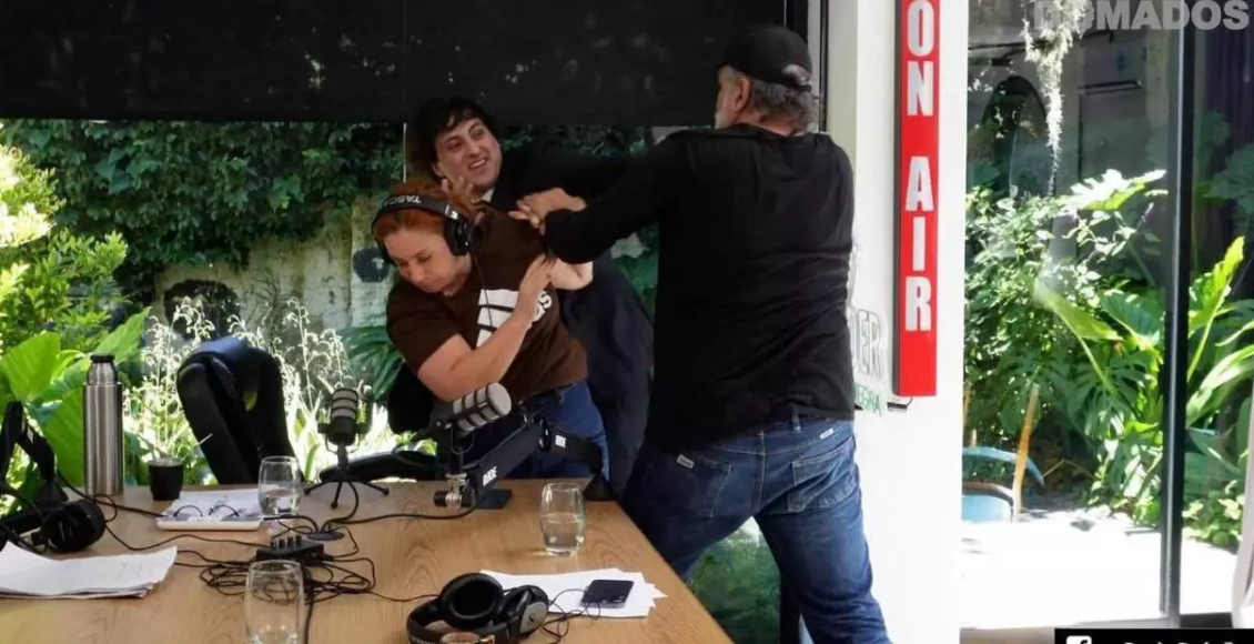 Durante la grabación de un programa de streaming, el dirigente sindical Eduardo Belliboni intentó agredir al militante libertario Fran Fijap. La periodista María Julia Oliván intervino para evitar la pelea y quedó en medio del altercado.