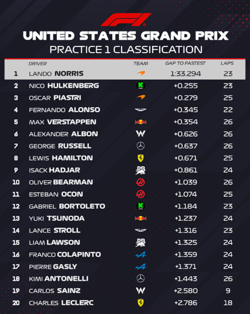 Televisación: Disney+ y Fox Sports (Latinoamérica) / F1TV (plataforma) / BandSports (Brasil) / DAZN (España) / ESPN Deportes (Estados Unidos) / Sky Italia (Italia) / Sky Sports (Reino Unido) #GPDeF1EEUU