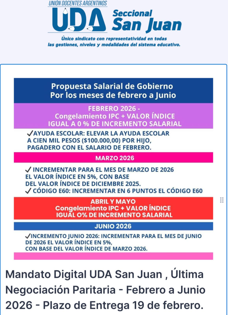 La Unión Docente Autónoma (UDA) de la Seccional San Juan informó a sus docentes sobre la puesta en marcha del Mandato Escolar Digital para recoger la postura oficial de la entidad de cara a la próxima reunión programada para el 20 de febrero. El objetivo es asegurar la más amplia participación y transparencia en la definición de la posición ante las autoridades del Gobierno, en un proceso que se destaca por su relevancia ante los recientes anuncios de política educativa.