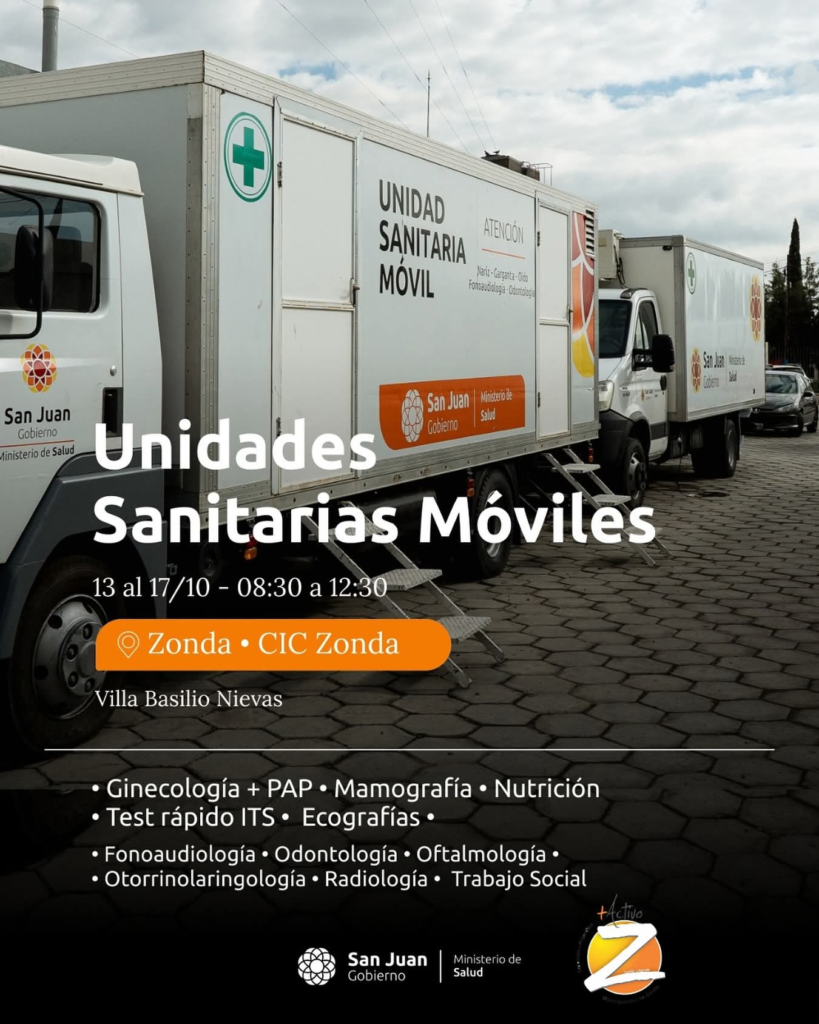 Esta iniciativa del Gobierno de San Juan, a través del Ministerio de Salud, busca acercar la atención primaria a la comunidad. Los servicios disponibles incluyen Ginecología (con PAP), Mamografía, Nutrición, Test rápido de ITS, Ecografías, Fonoaudiología, Odontología, Oftalmología, Otorrinolaringología, Radiología y Trabajo Social. #UnidadesSanitariasEnZonda