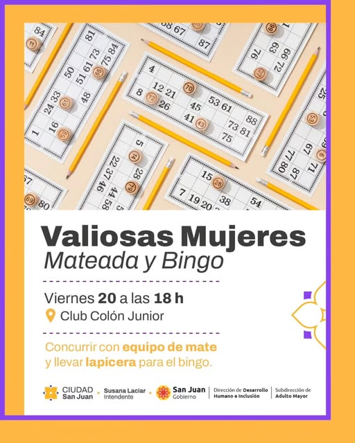 La Municipalidad de la Ciudad de San Juan invita a todas las mujeres a participar de una tarde especial de encuentro, charla y diversión. El evento “Valiosas Mujeres: Mateada y Bingo” se realizará el viernes 20 a las 18:00 hs en el Club Colón Junior.
